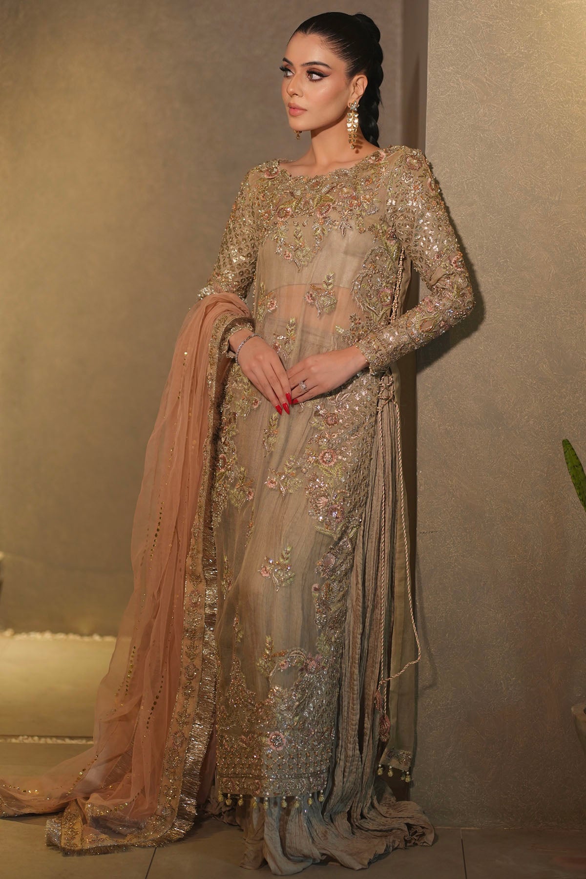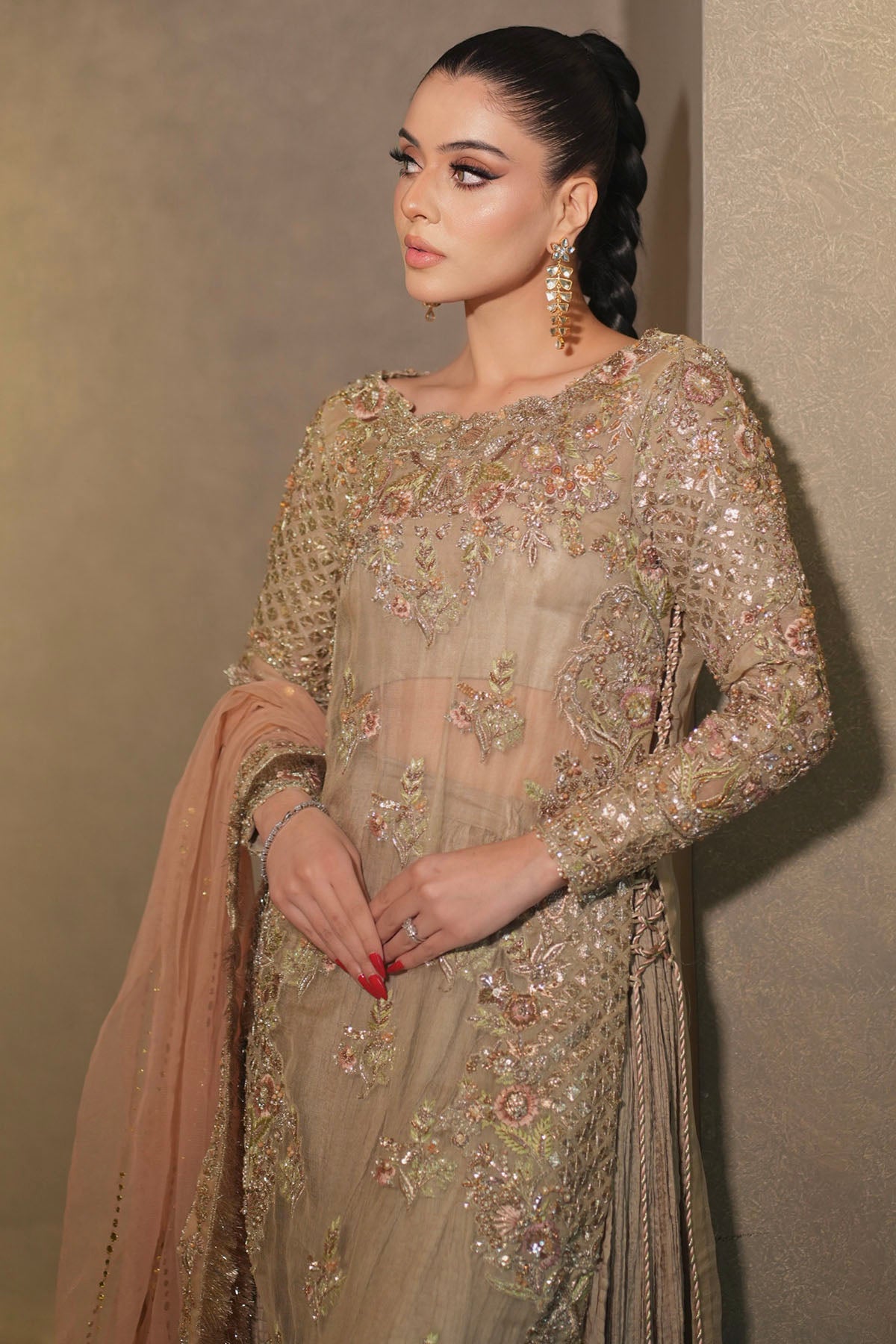Celebrate Subtle Luxury With Our Beige Organza Outfit, Featuring Pastel Embroidery, Hand Detailing With Pastel Embroidery, Meticulous Kora-Dabka Work, And Striking Heavy Gota All Over The Sleeves And Shirt To Give Heritage Meets Modern Grace Look.