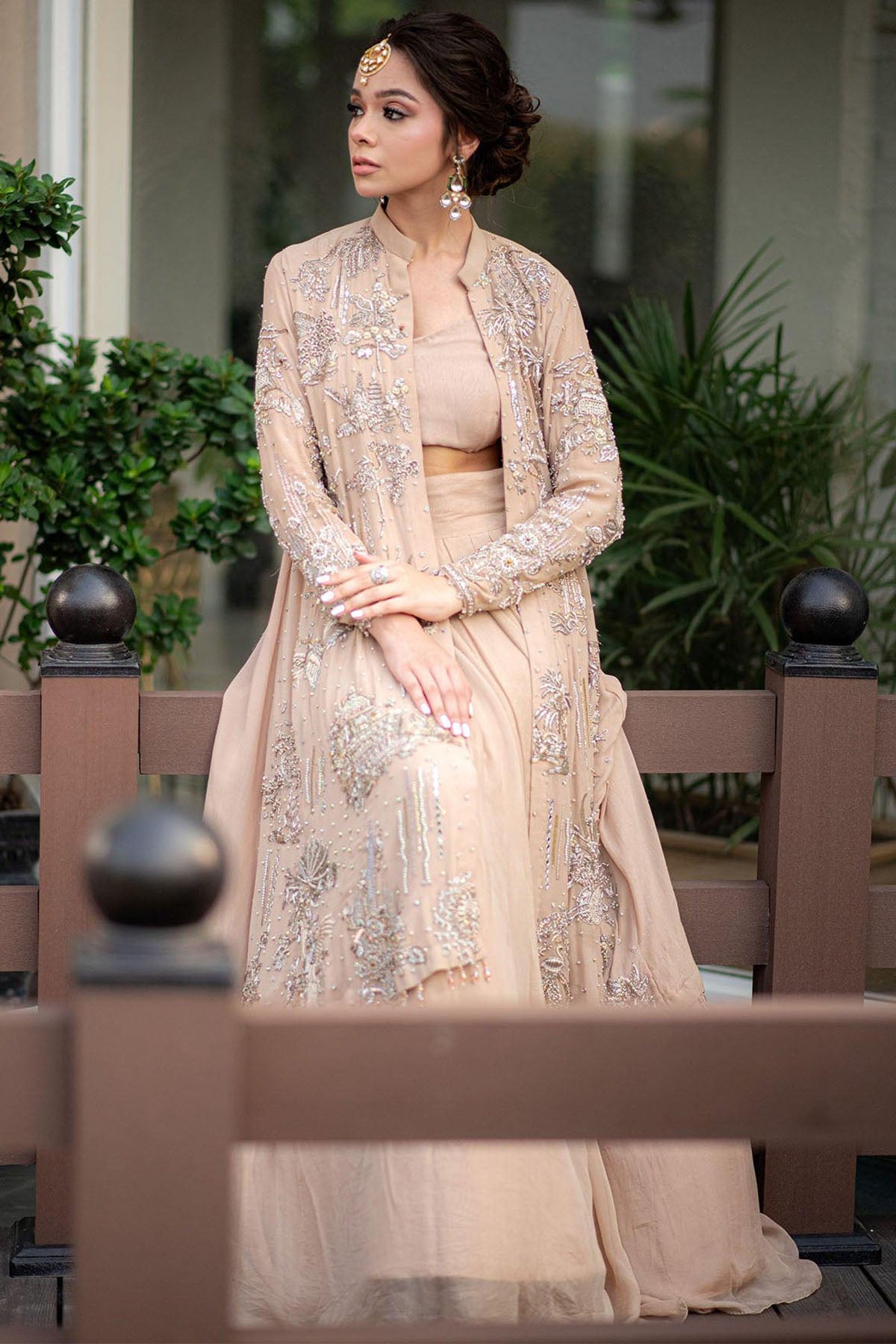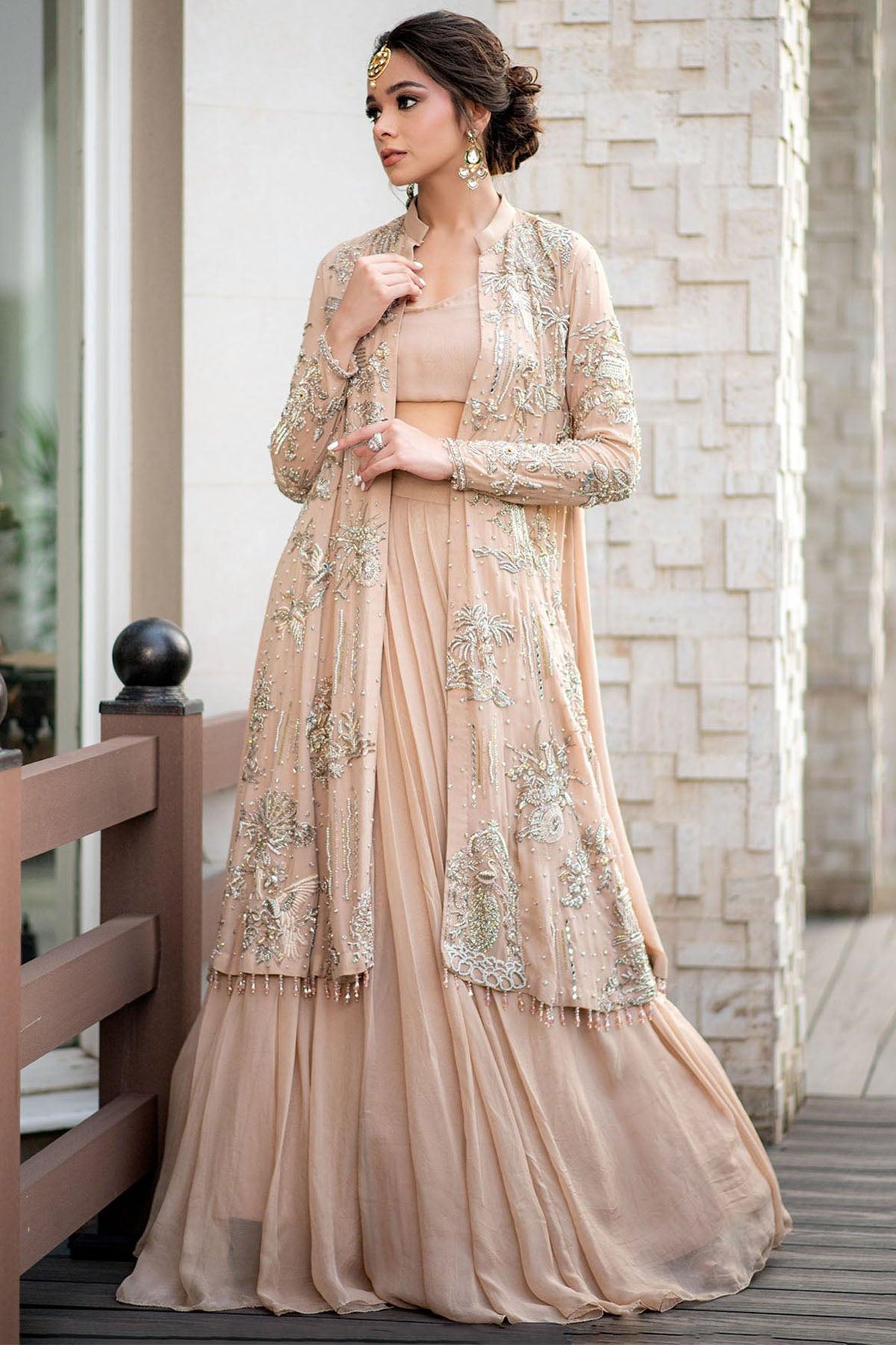 Layers Of Pale Peach Chiffon Are Cut Into A Flared Lehenga And Bustier .