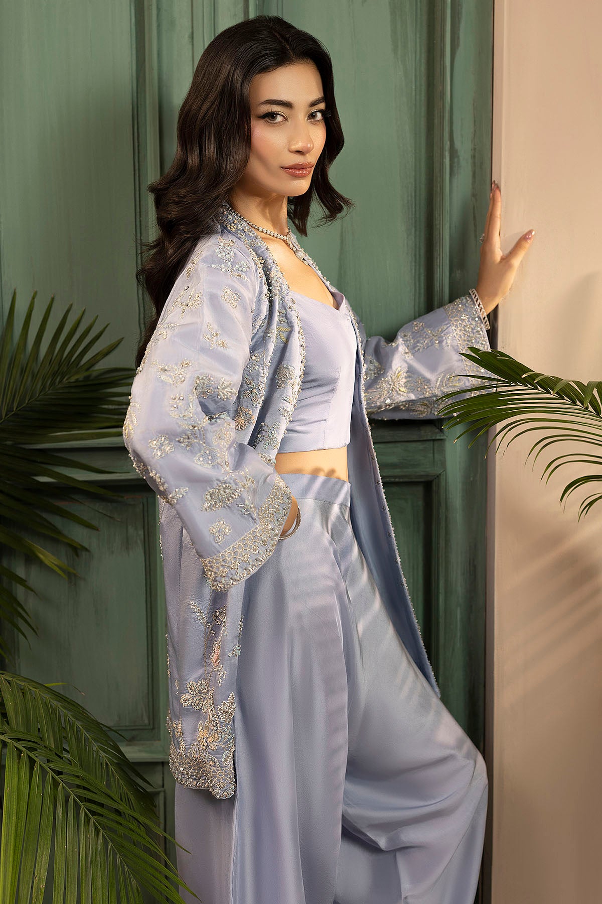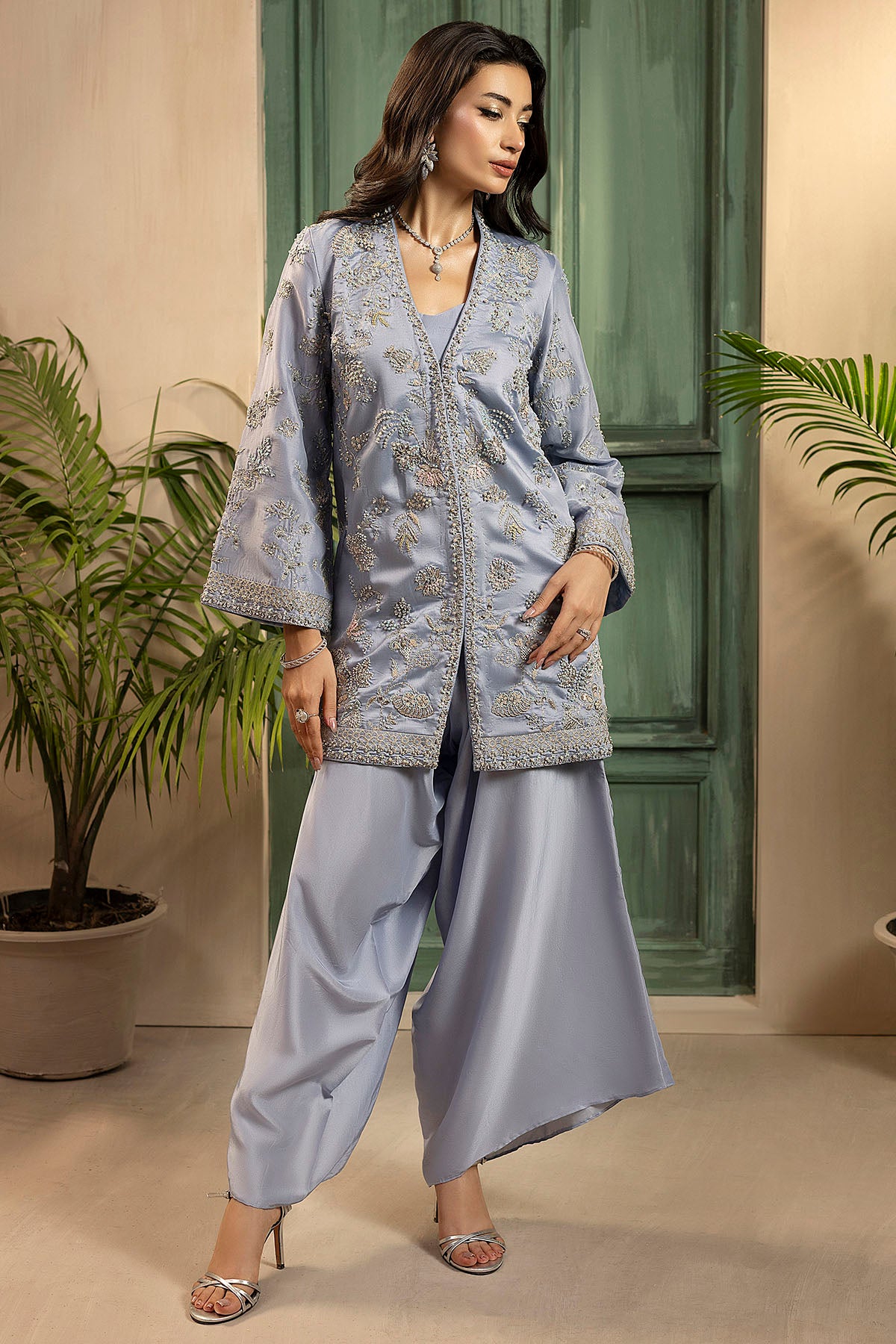 A Chic Dusty Blue Jacket-Style Shirt With A Modern Silhouette, Paired With Wide Flared Trousers.