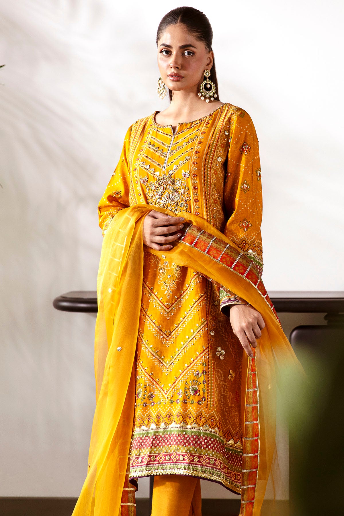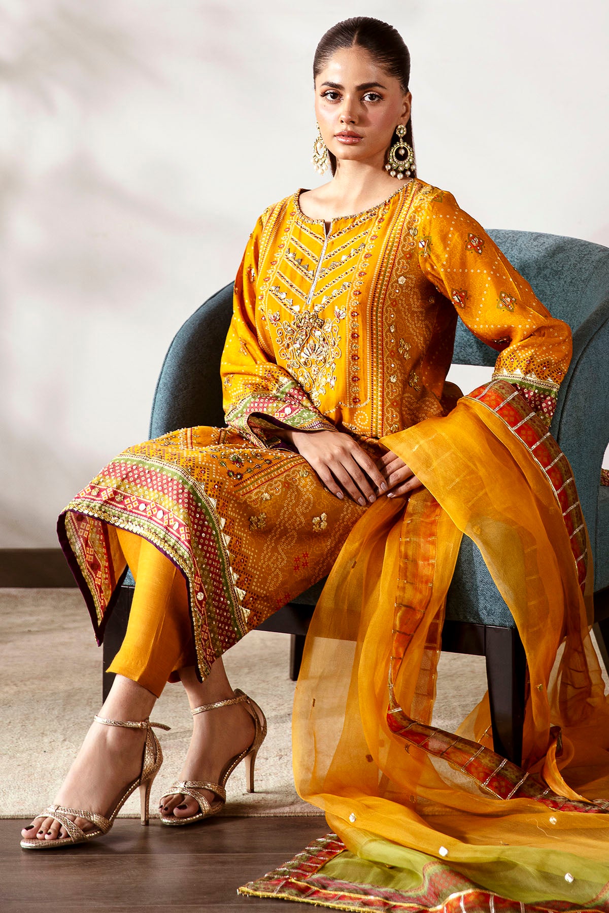It Is Paired With A Two-Tone Organza Dupatta Featuring Exquisite Gota Finishing, Completing The Look With Grace.
