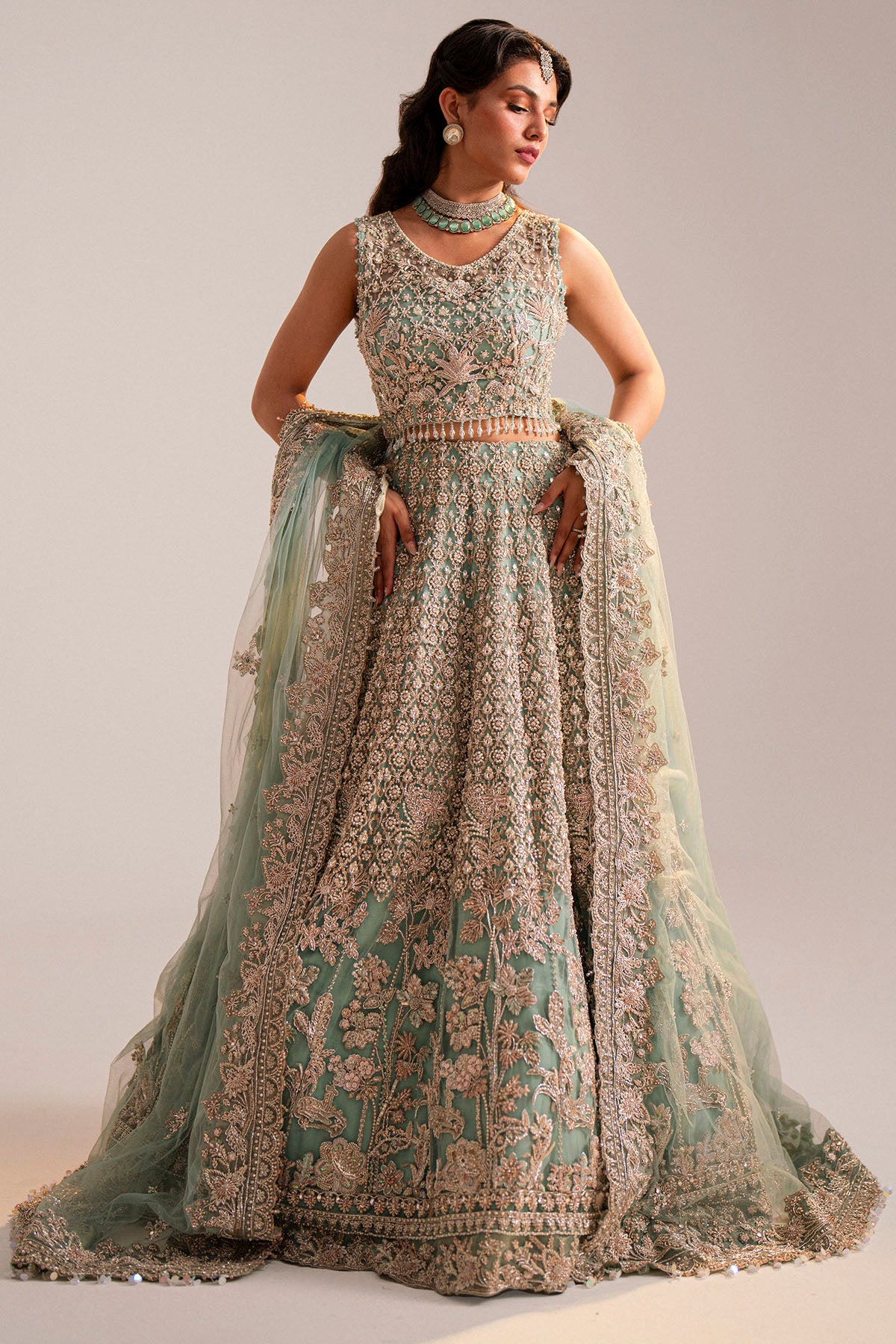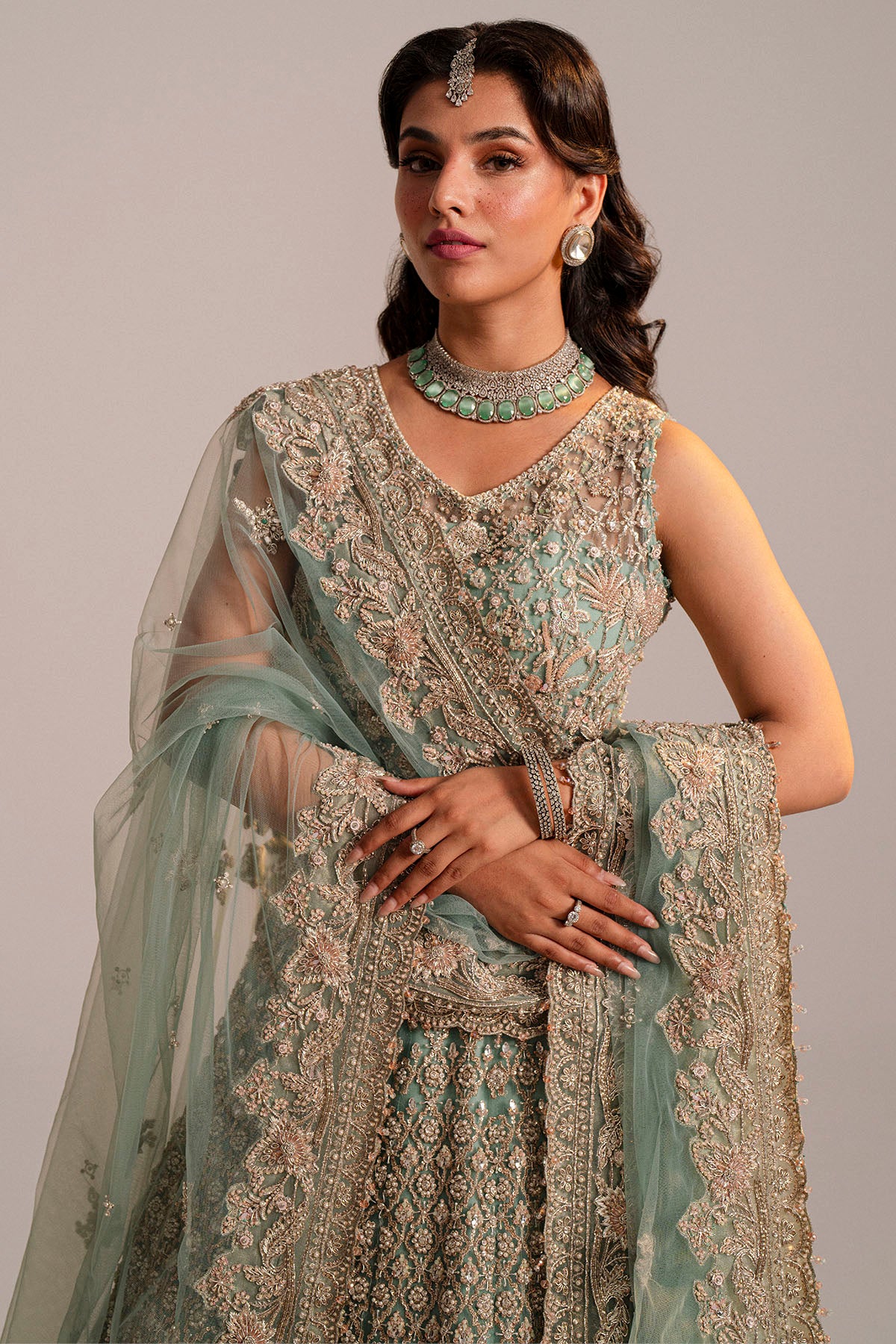The Intricately Worked Lehnga Is Complemented In The Same Shade Net Dupatta And Heavily Worked Borders Laden With Heavy Sequins, And Floral Motifs As Well As Tissue Fabric Trimming.