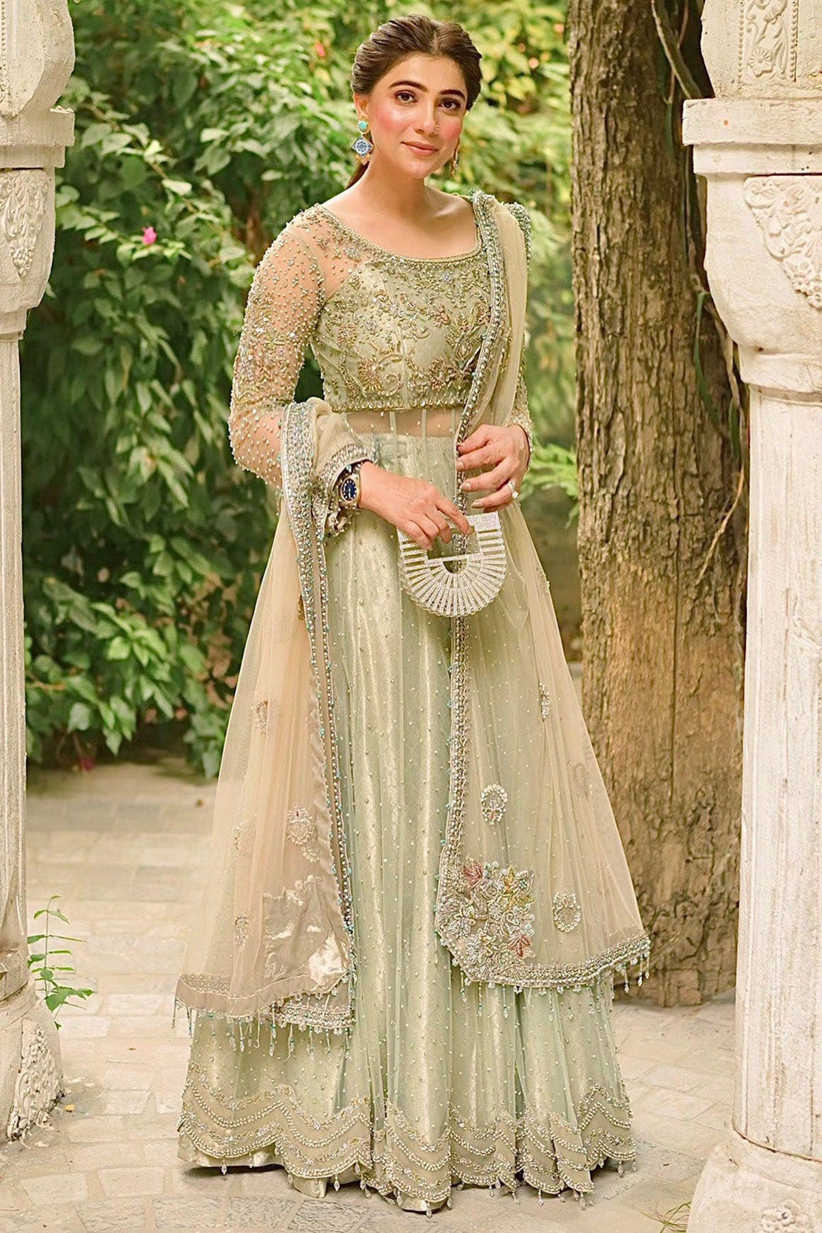 The Gorgeous Sheer Kalidaar Is Layered Over A Subtly Shimmering, Jamewaar Lehgna For An Amazingly Flattering Silhouette.